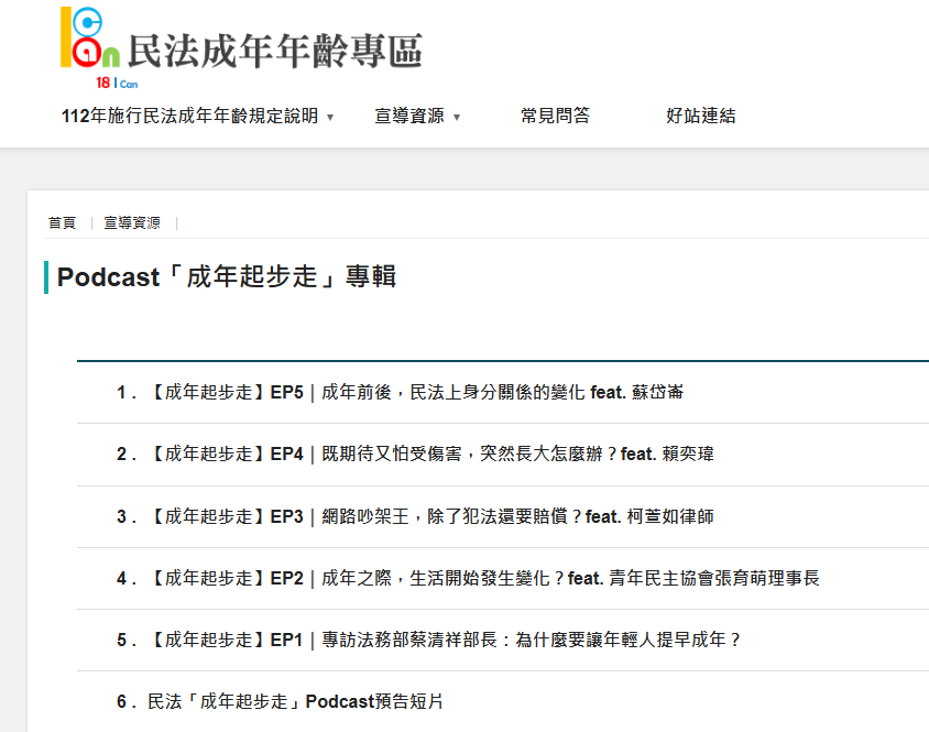 「18歲成年起步向前行!快來法務部民法成年年齡專區認識成年大小事」Post author:nnkiehtn031Post published:2026-03-30Post category:行政公告 / 高中部法務部民法成年年齡專區 https://topics.moj.gov.tw/33020/Podcast「成年起步走」專輯 Post Views: 36Read more articles上一篇文章財政部南區國稅局舉辦「財政部115年統一發票盃路跑活動(臺南場)」,檢附活動文宣、報名簡章及活動主視覺Banner各1份,請鼓勵學生踴躍報名參加下一篇文章115年國中教育會考訂於5月16日、5月17日辦理,請鼓勵所屬教職員踴躍擔任監試委員