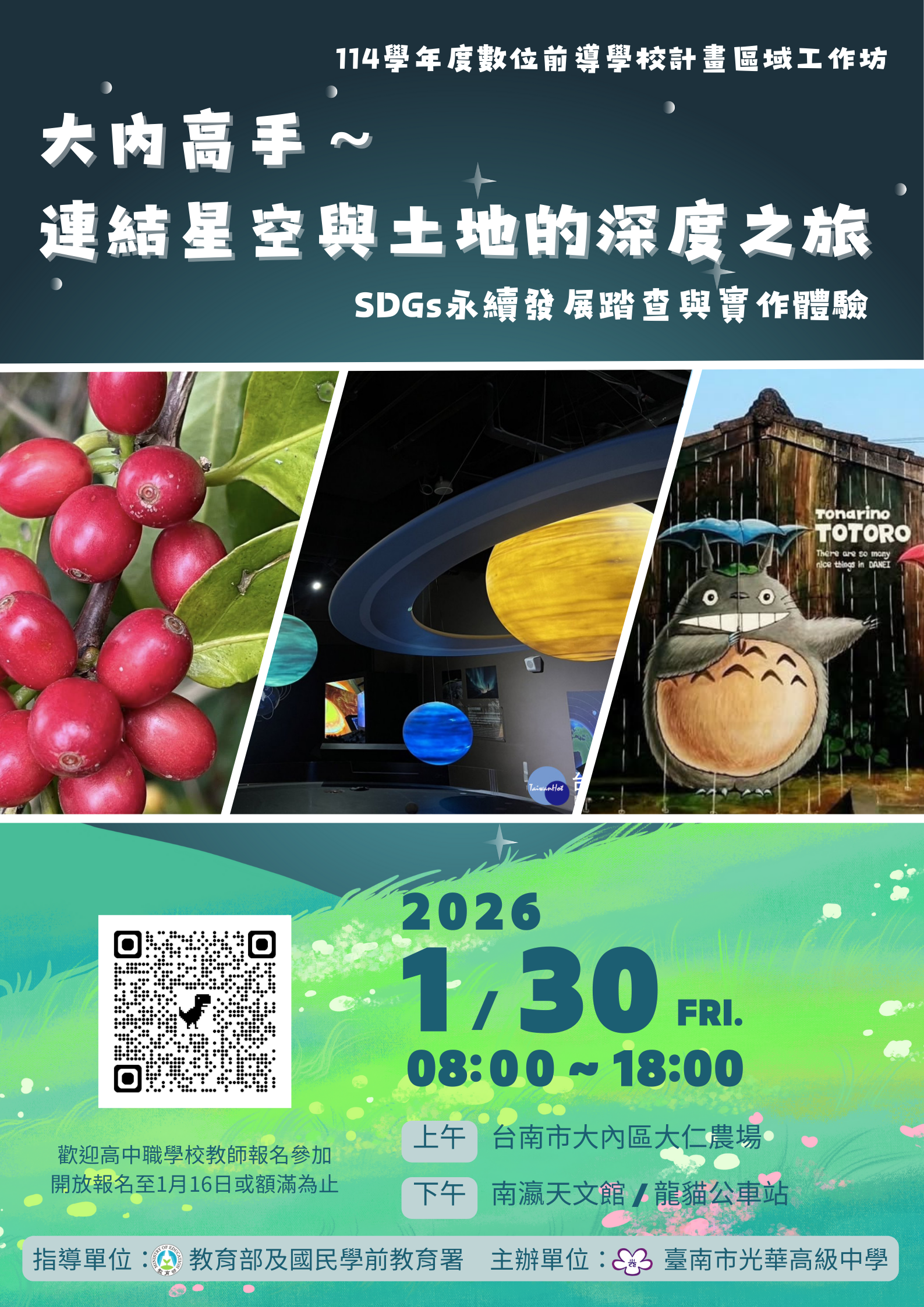 二、活動以SDGs永續發展目標4「優質教育」、目標11「永續城鄉」及目標12「永續消費與生產」為核心,規劃參訪臺南大內區大仁農場、南瀛天文館及龍貓公車站。期能透過跨域學習,提供教師課程設計之教學素材,以落實環境教育與永續發展。