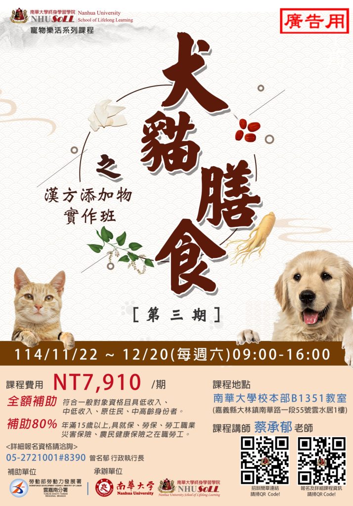 南華大學114年11-12月份開辦之犬貓膳食之漢方添加物實作班第03期課程資訊Post author:nnkiehtn002Post published:2025-11-10Post category:行政公告 Post Views: 9Read more articles上一篇文章國立彰化師範大學推廣教育「精緻Moocs系列課程」之「全人視角-融合教育攻略」、「特殊教育導論」、「臺灣台語正音與拼音」、「臺灣台語認證B2增能班」、「諮商師的基本功-諮商理論」等數位課程招生宣傳DM下一篇文章國立中央大學客家語文暨社會科學學系「客家語文碩士班」及「客家社會及政策碩士班」115學年度考試入學招生訊息