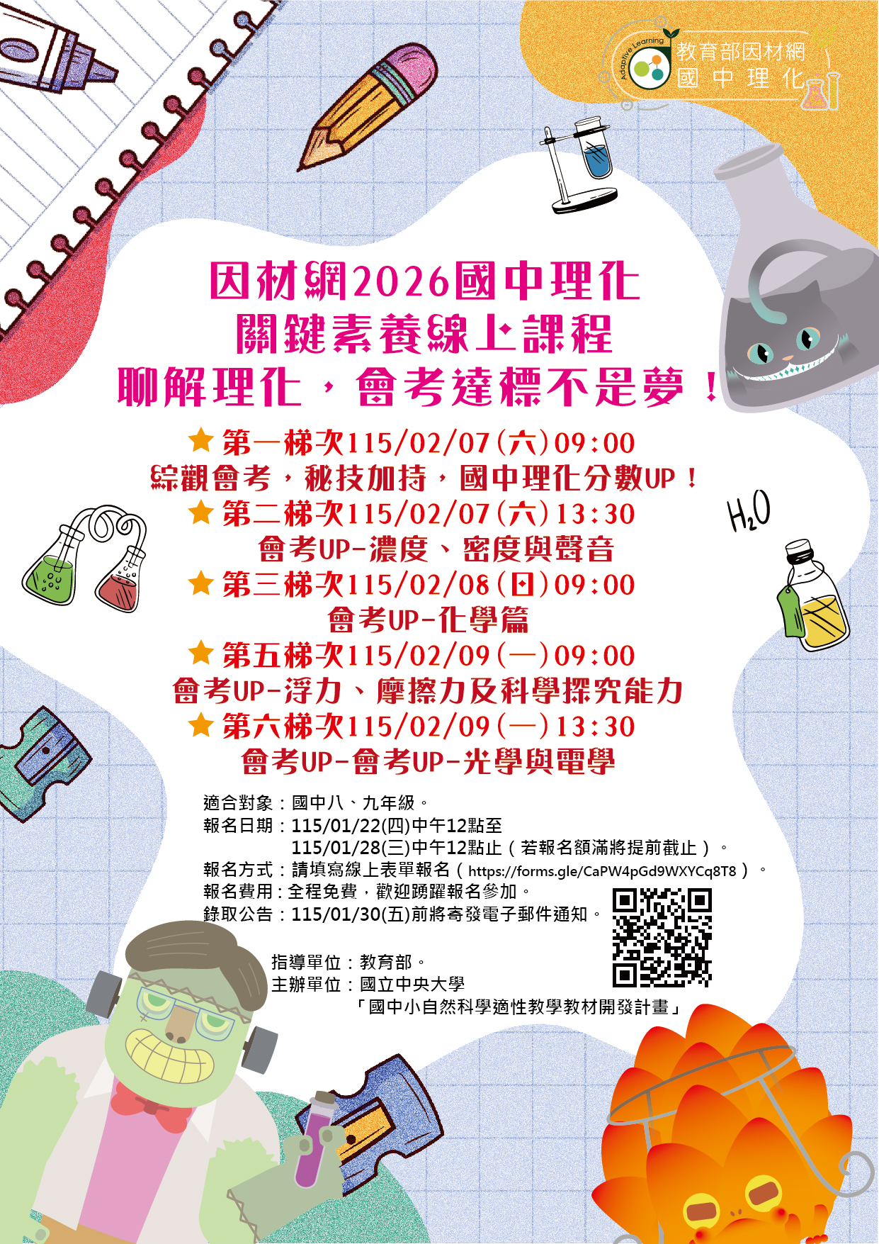 國立中央大學執行教育部國中小自然科學適性教學教材研發實驗計畫辦理「2026國中理化線上課程」