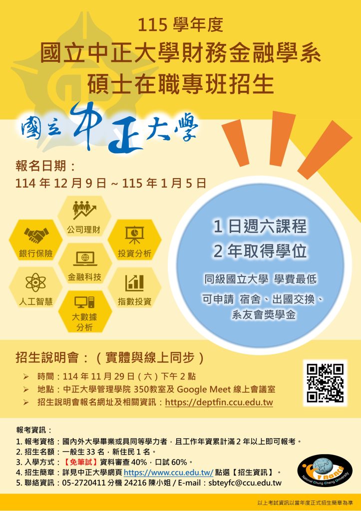 國立中正大學財務金融學系碩士在職專班115學年度招生宣傳海報Post author:nnkiehtn002Post published:2025-11-07Post category:行政公告 Post Views: 10Read more articles上一篇文章國立臺灣師範大學115學年度教育學系碩士在職專班招生資訊下一篇文章轉知:國立臺南生活美學館文化體驗教育計畫(南區)成果展