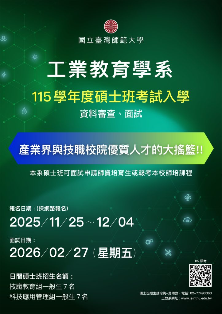 國立臺灣師範大學工業教育學系「115學年度碩士班、碩士在職專班」招生資訊Post author:nnkiehtn002Post published:2025-11-20Post category:行政公告 Post Views: 67Read more articles上一篇文章國立臺北大學辦理同步遠距AI財金課程–「AI創新財報分析技術初階班」簡章暨報名表下一篇文章訊息轉知:「全民+1 政府相挺」普發現金領取及防詐宣導事宜