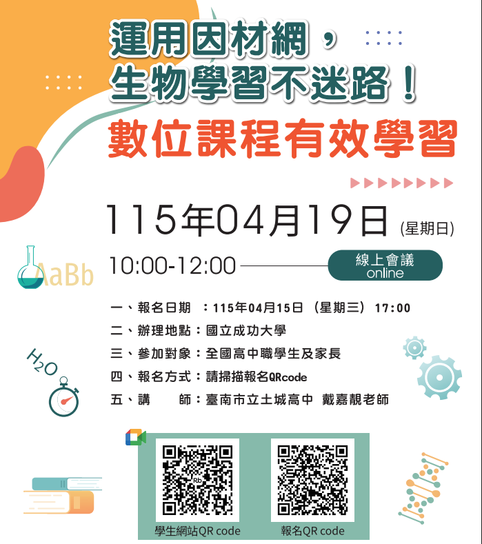 轉知:「因材網生物科線上教材介紹與自主學習應用」線上工作坊Post author:nnkiehtn007Post published:2026-03-30Post category:行政公告 / 高中部成大主辦「運用因材網生物學習不迷路!數位課程有效學習」工作坊將於115年4月19日以線上方式舉辦,相關資訊及報名資料詳如附件海報。參與工作坊並完成自主學習任務,得以獲得本計畫團隊修課證明。 Post Views: 14Read more articles上一篇文章校園及青少年性教育、性健康及性病防治宣導