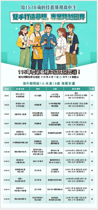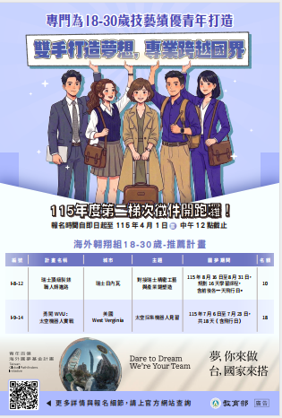 轉知:「青年百億海外圓夢基金計畫」Post author:nnkiehtn031Post published:2026-03-26Post category:行政公告 / 高中部詳細資訊請參考官方宣傳網站連結(網址:https://twpathfinder.org/) Post Views: 22Read more articles上一篇文章歷史學科中心114學年度館際合作—國立臺灣歷史博物館「臺灣女子移動紀事特展」教學設計工作坊