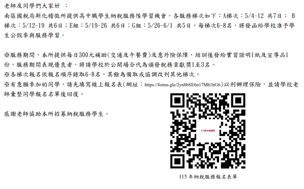 一、依據財政部南區國稅局「115年度學生租稅教育及納稅服務隊學習服務執行計畫」辦理。