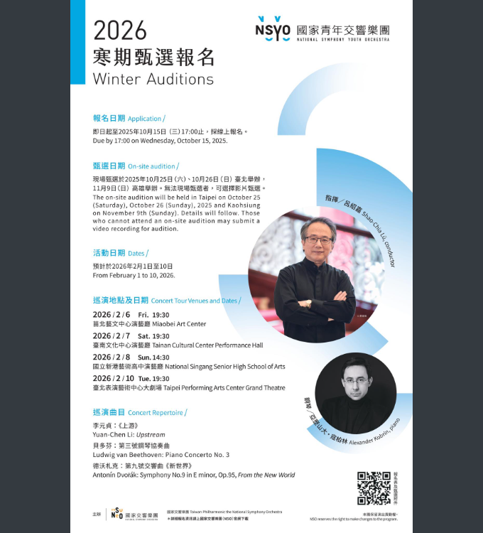 「2026年國家青年交響樂團寒期活動」現正報名中Post author:nnkiehtn066Post published:2025-10-03Post category:國中部 / 高中部詳閱甄選海報或於以下網站查詢及報名 https://npacnso.org/zh/education/nsyo。 Post Views: 19Read more articles上一篇文章朝陽科技大學辦理「第5屆全國高中職暨大專校院英語繪本創意教學競賽」辦法