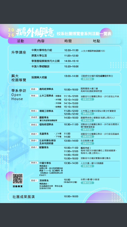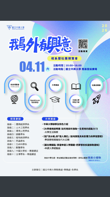 國立中興大學4月11日(六)辦理「2026鵝外有興意-校系暨社團博覽會」活動Post author:nnkiehtn055Post published:2026-03-30Post category:高中部一、為增進高中學生認識大學校系特色及未來升學進路,協助學生自我探索並激發學習興趣,將於本校惠蓀堂前廣場辦理旨揭活動,敬邀貴校師生共襄盛舉。二、本次活動內容包含校系博覽會、OpenHouse校系參訪、升學講座、社團博覽會等,詳細資訊可至FB粉專查詢:「興大鵝外有興意-校系暨社團博覽會」。三、如有任何疑問,請洽本校聯絡窗口:招生暨資訊組蔡佳怡專案助理04-22840216#32。 Post Views: 78Read more articles上一篇文章轉知:「因材網生物科線上教材介紹與自主學習應用」線上工作坊下一篇文章國立宜蘭大學4月18日(六)辦理「115學年度大學申請入學招生說明會」