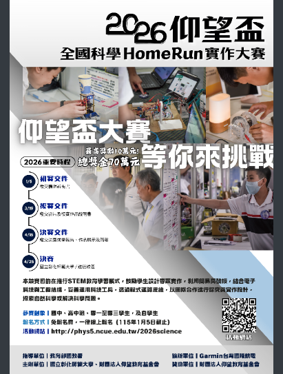 國立彰化師範大學辦理「2026仰望盃全國科學HomeRun實作大賽」Post author:nnkiehtn049Post published:2025-10-16Post category:國中部 / 高中部說明:一、為鼓勵學生進行設計思考與專題實作,並推廣STEM教育中自然科學領域之學習與應用,特與財團法人仰望教育基金會共同辦理競賽。二、「2026仰望盃全國科學HomeRun實作大賽」訂於115年4月25日(星期六)假國立彰化師範大學舉行。三、本競賽即日起受理報名,報名截止日期為115年1月5日(星期一),相關實施辦法請參閱附件,。四、檢附競賽手冊及海報乙份,請惠予公告並鼓勵參與。競賽手冊下載海報-7下載 Post Views: 11Read more articles上一篇文章第七屆衛星科學工作坊暨臺灣太空科學聯盟學生日活動下一篇文章國立中央大學辦理線上講座:《國際科學教育論壇系列20》—— 「AI and Higher Education