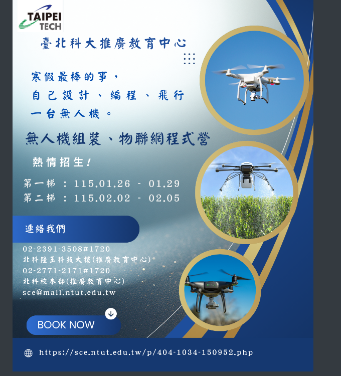 國立臺北科技大學進修部推廣教育中心預定於115年02月02日開辦【無人機組裝、物聯網程式營】課程Post author:nnkiehtn055Post published:2026-01-27Post category:高中部旨揭課程資訊請以Google搜尋 : 【無人機組裝、物聯網程式營】進入本校活動網頁查詢或請來電國立臺北科大學進修部推廣教育中心 (02) 2391-3508或(02)2771-2171分機1720洽詢。 Post Views: 8Read more articles上一篇文章115年臺南市政府勞工局辦理輔導身心障礙者參加國家考試補習及汽車駕駛訓練考照補助計畫下一篇文章2026年「科學探究競賽-這樣教我就懂」」