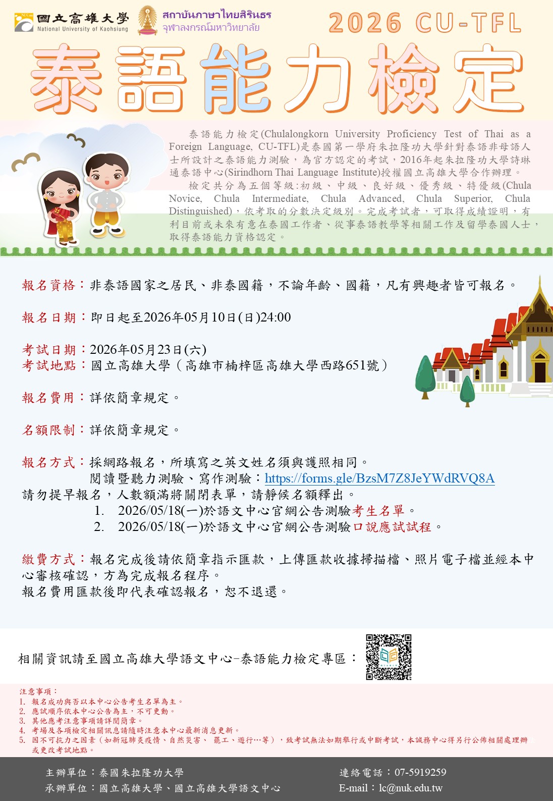 一、旨揭檢定係泰國朱拉隆功大學詩琳通泰語中心授權本校辦理,該檢定為官方認定考試。