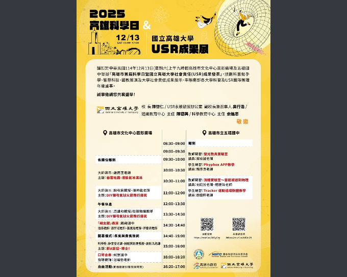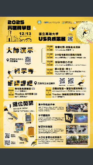 一、為推廣科學教育與分享本校師生執行USR計畫豐碩成果,辦理旨揭成果展,透過大師演示、科學秀、大眾科普、半導體製程體驗、智慧科技體驗,及教師與學生研習,以擴大各界交流。