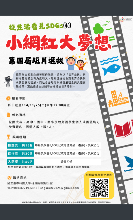臺中科技大學「小網紅大夢想」第四屆短片選拔活動Post author:中學部衛生組長Post published:2025-09-30Post category:國中部 / 高中部A09600000Q_1140019342_doc1_Attach2下載下載1下載 Post Views: 97Read more articles上一篇文章運動部全民運動署委請國立臺灣師範大學辦理「114年度山野教育推廣實施計畫」之親山型高山體驗活動及師資增能初階體驗課程簡章各1份,請轉知所屬踴躍報名參與下一篇文章114學年度高中部教務處家長日升學輔導簡報公告