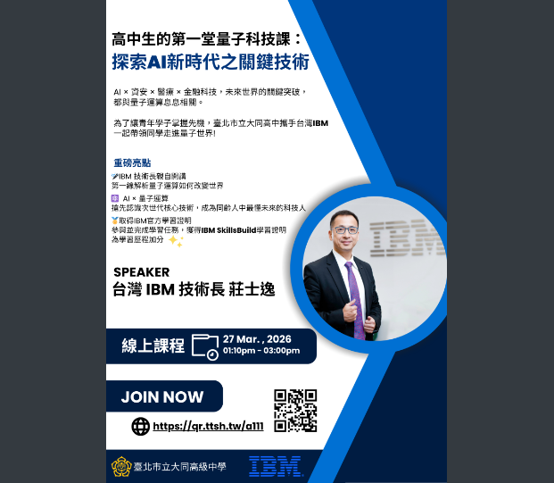臺北市立大同高級中學辦理「高中生的第一堂量子科技課」專題講座Post author:nnkiehtn049Post published:2026-03-19Post category:國中部 / 高中部請參考公文-8下載下載-3下載 Post Views: 9Read more articles上一篇文章清華大學辦理「2026諾貝爾大師在清華」演講