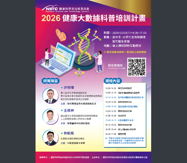 臺北醫學大學「健康大數據科普培訓計畫」Post author:nnkiehtn049Post published:2026-01-12Post category:高中部如附件!公文-2下載海報下載 Post Views: 8Read more articles上一篇文章國立勤益科技大學辦理2026年第20屆台灣智慧型機器人大賽下一篇文章國立臺灣科學教育館辦理「115年青少年科學人才培育計畫」