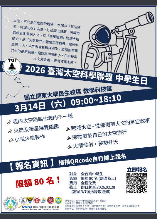 一、旨揭活動主題為「2026 臺灣太空科學聯盟 中學生日」,邀請各校教授、各企業人士來校分享;誠摯邀請貴校學生參