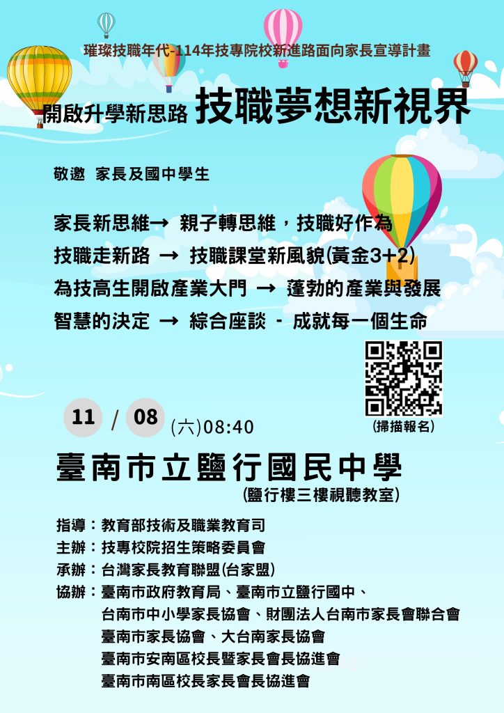 四、為提供家長及學生了解新五專升學制度的機會,務請學校利用學校網站、校園公佈欄、班級群組等方式,向家長轉知本活動資訊。