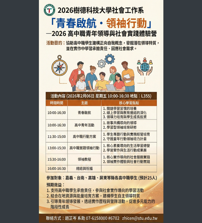 五、如有任何疑問,請逕洽社會工作系趙芷岑系助,聯絡電話(07)6158000分機6702,EMAIL:zhicen@stu.edu.tw。