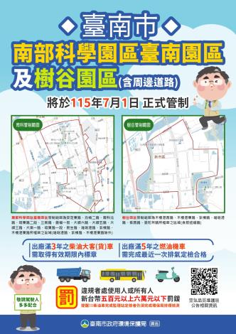為維護園區與周邊地區的空氣品質,自115年7月1日起,南科及樹谷園區(含週邊道路)將正式開始空品維護區管制。Post author:中學部衛生組長Post published:2025-11-06Post category:最新消息https://web.tainan.gov.tw/epb/News_Content.aspx?n=15914&s=8773166#1150701空氣品質下載 Post Views: 15Read more articles上一篇文章本校總務處幹事甄選錄取公告