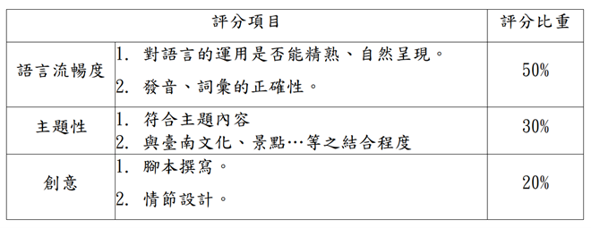- 主題:以本土教育為實施範疇,進行本市轄域內各歷史及文化園區;國、市定古蹟;國家風景區;文化活動;在地產業;美食介紹;各遊學路線,以及各校校園、學區、行政區內具特色之自然環境或人文歷史景點導覽,適時運用特色語言解說,導入多元語言介紹臺南特色。