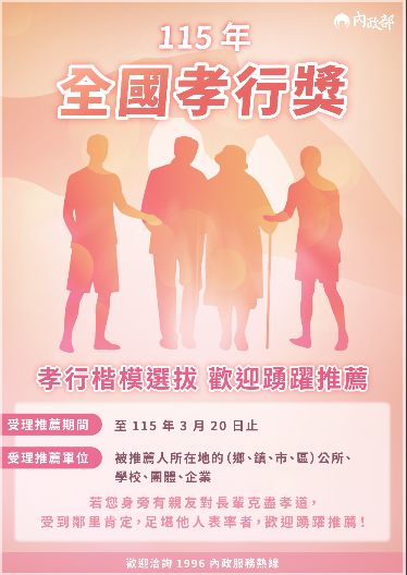 轉知:內政部「115年全國孝行獎孝行楷模選拔」歡迎踴躍推薦Post author:nnkiehtn031Post published:2026-01-21Post category:國中部 / 最新消息 / 行政公告 / 高中部一、依教育部115年1月8日臺教學(二)字第1140139554號書函辦理。二、115年全國孝行獎活動實施計畫請參看附件。115年全國孝行獎活動實施計畫含推薦書下載 Post Views: 24Read more articles上一篇文章114學年度 第二學期 高中部網球運動績優生 轉學考簡章下一篇文章稅務宣導