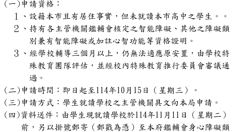 轉知:新北市114學年度身心障礙學生重新安置服務群科申請相關規定Post author:中學部輔導組Post published:2025-10-11Post category:最新消息 / 行政公告詳見附件安置服務群科申請相關規定下載 Post Views: 13Read more articles上一篇文章轉知:青年發展署辦理青年領航計畫下一篇文章恭賀許省盛董事長當選114學年度南科實中家長會會長