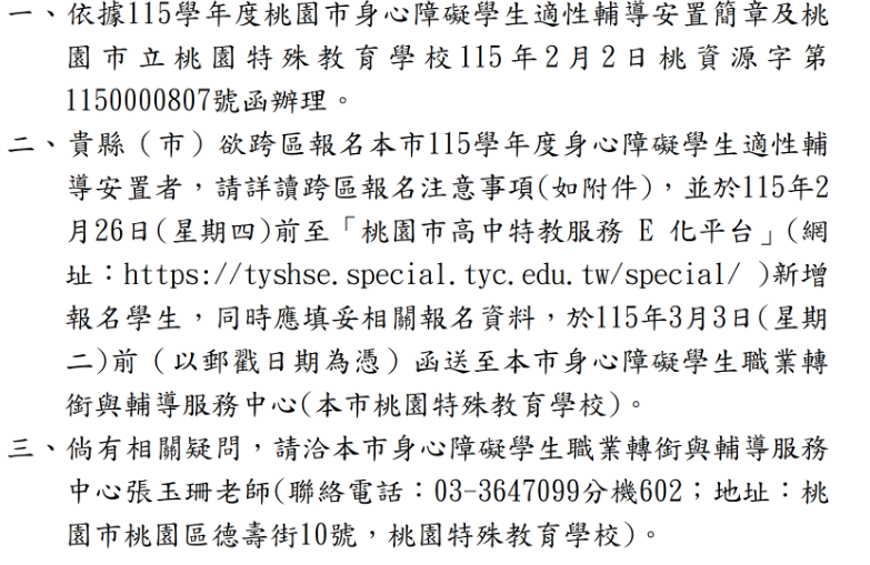 轉知:桃園市115學年庿身心障礙學生適性輔導安置報名作業期程及注意事項Post author:中學部輔導組Post published:2026-02-12Post category:最新消息 / 行政公告安置報名資料送件一案_函下載校報名作業期程及注意事項下載 Post Views: 21Read more articles上一篇文章稅務宣導下一篇文章轉知:身心障礙者權利公約(CRPD)第三次國家報告條約專要文件及附件