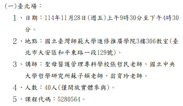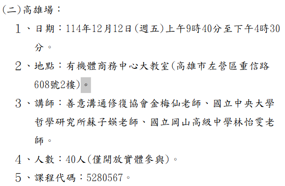 轉知:114學年度生命教育學科中心研習送到家「靈性、自我與生命關懷主題課程」Post author:中學部輔導組Post published:2025-10-20Post category:最新消息 / 行政公告一、課程內容資訊 二、請至「全國教師在職進修資訊網」報名。 靈性、自我與生命關懷主題課程-實施計畫下載 Post Views: 10Read more articles上一篇文章「未來碳匯的可能性:從樹木到城市綠化的碳儲存潛力」研討會下一篇文章本校114學年度第一學期身心障礙學生臨僱特教學生助理人員甄選簡章