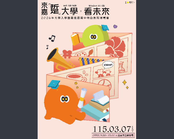 轉知2026年大學入學暨嘉義區高中特色教育博覽會Post author:中學部輔導組Post published:2026-02-04Post category:最新消息 / 行政公告博覽會相關資訊如下:(一)時間:115年3月7日(週六)上午9時至下午3時。(二)地點:嘉義市立棒球場前廣場(嘉義市東區山仔頂249-1號)。海報下載來文-1下載 Post Views: 14Read more articles上一篇文章轉知:政治大學115學年度大學申請入學線上說明會下一篇文章轉知104人力銀行落點分析及學習歷程自述撰寫指引