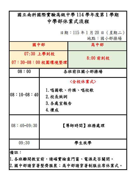 [重要]114學年度第一學期中學部休業式流程Post author:nnkiehtn031Post published:2025-12-18Post category:國中部 / 最新消息 / 置頂 / 行政公告 / 高中部 114學年度第一學期休業式採全校共同辦理 定於115年1月20日(二)08:10於國小部操場舉行 (08:10~08:40) 當日高中部及國中部學生定於09:30放學 休業式當日詳細流程請參閱附件114-1中學部休業式下載 Post Views: 103Read more articles上一篇文章「生成式AI×教學創新:線上桌遊課程設計」研習下一篇文章國立臺北大學「114學年度公共事務暨管理碩士學分班招生簡章」