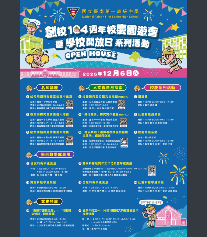 [公告]國立臺南一中-校慶園遊會暨「學校開放日」系列活動Post author:nnkiehtn010Post published:2025-11-20Post category:最新消息 Post Views: 259Read more articles上一篇文章🎉 114學年度雙語冬令營報名公告 Bilingual Winter Camp下一篇文章景文科技大學2026全國高中職專題競賽