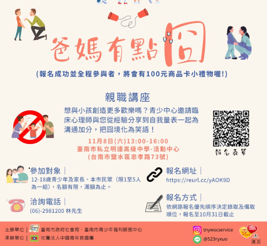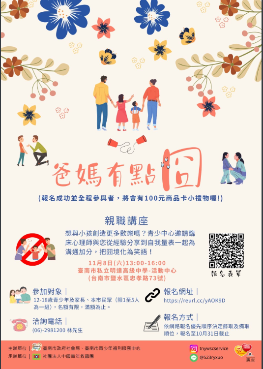 114年11月8日台南市青少年福利服務中心親職講座Post author:nnkiehtn056Post published:2025-10-30Post category:最新消息實施辦法下載海報-11下載 Post Views: 16Read more articles上一篇文章2026中原大學第三屆財務金融學系現金流大賽–財之呼吸 壹之型:現金流!現正報名中